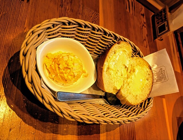コーンスープに、ローブパン(バター)、手作りたまごペースト(540円)。
