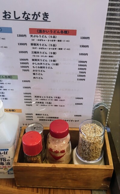 おしながきの一部(20250330現在)と、卓上の調味料。