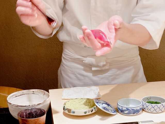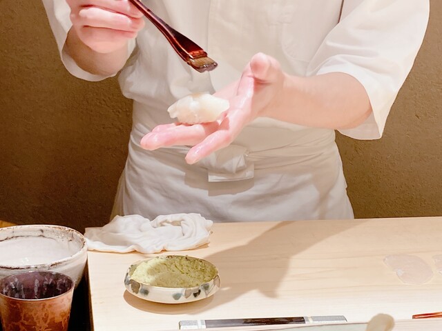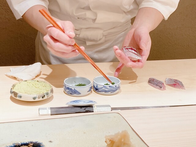 薬味はワサビだけでなく、シソやショウガなど、ネタを一番おいしく食べられるものをつけてもらえます。