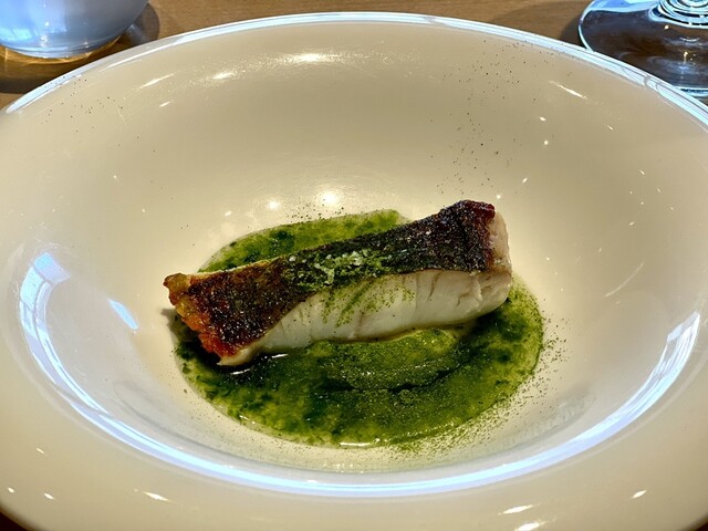 ->焼いたヒラメ。海藻ソース