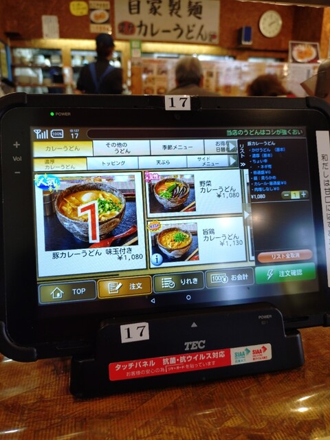 初訪店ですがカレーうどんのお店ですっ!豚カレーうどん&味玉(かけ・ 濃厚汁・ちょい辛・ねぎ有・麺やわらかめ)をハヤリノタッチパネルで注文しました。タッチパネルの上にはコシの強い麺ゆえ20分かかるとの注意書きです。ところがど〜でせう、10分強で着卓のワタクシのソレです!