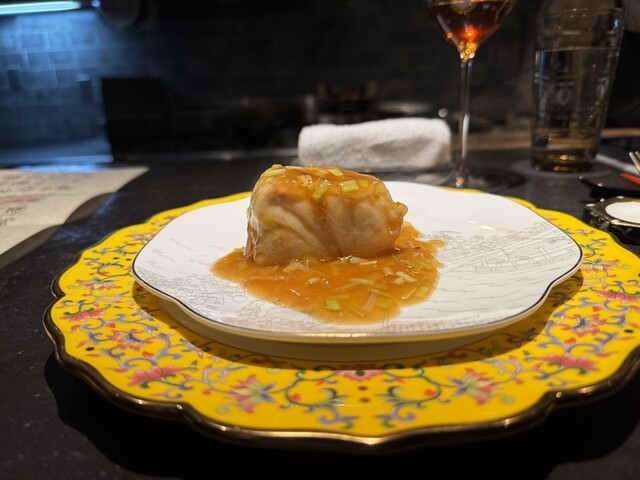 黄金の皿に盛られた蒸し料理は、香り立つソースの濃淡が見事で、