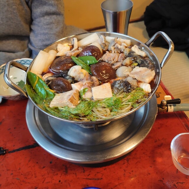 源コース10,000円を予約して昼に来店。大雨でしたが予約以外のお客さんも並んでおり、12時30分くらいには満員でした。二階のお座敷でしたがお願いしたら座椅子を用意いただけるみたいです。コースは名代あんこう鍋、きも刺し、煮こごり、唐揚げ、とも和え、前菜、デザート。あんこう鍋、きも刺し、締めのおじやが絶品でした。