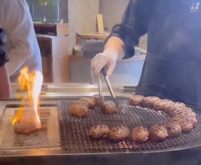 大人気のこちらのハンバーグ!予約はテーブルチェックのみですぐ完売してしまう。目の前で焼いてくれるパフォーマンスにますます期待が高鳴る。小さめのハンバーグ3個にご飯おかわり自由。卵と味噌汁もついて180...