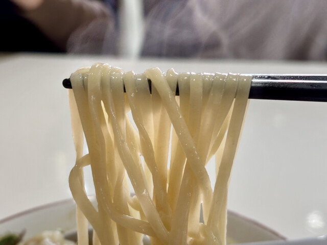 幅の狭い平打ち麺は、柔らかめでツルツルっと入ります。柔らかめですが、伸びるということはありません。
