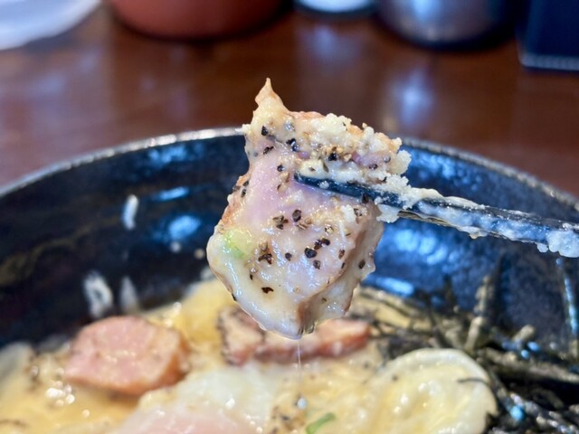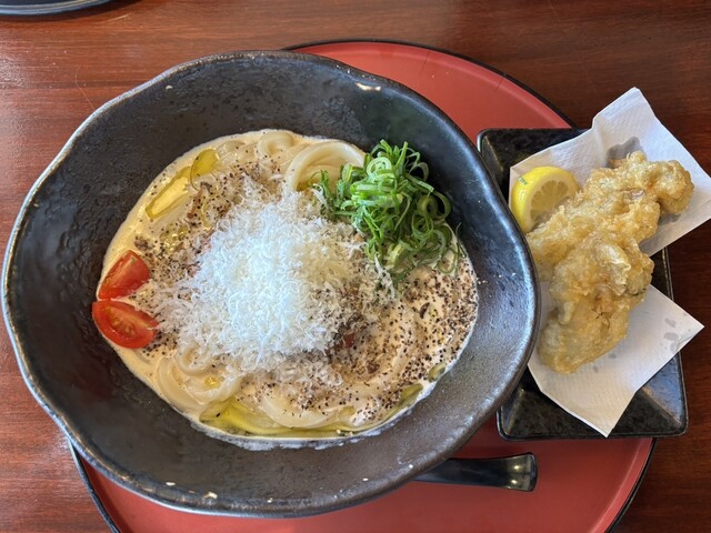 【カルボナーラうどん】と【二子さといもの天ぷら】
