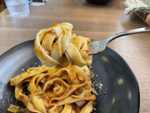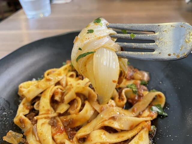 ラグーはフランスの煮込み料理でイタリアのミートソースの元になったもの。こちらのラグーは肉の旨みがあり、少し辛味を感じます。それに対して、トッピングの新玉ねぎのオーブン焼きの甘いこと。パスタのモチモチした食感がいい。