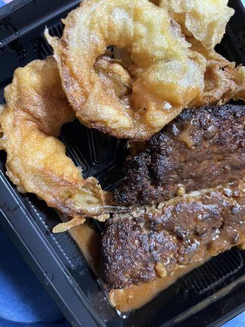 テイクアウトでお弁当お願いしました。写真は一切れ食べた後(笑)我慢出来ずに。電話で事前予約したら、20分後ぐらいに取りに行くシステム。ここのチキン南蛮がめっちゃ好きだけど、この日は時間が遅くなったので、チキン売り切れだと言う事で、ハンバーグ弁当にした。ちょっと冷めたからか、今回のはあまりジューシーじゃなかったけど、店で食べた時はすんごいボリュームだし、めちゃうま。はらぺこさん達集まれ!