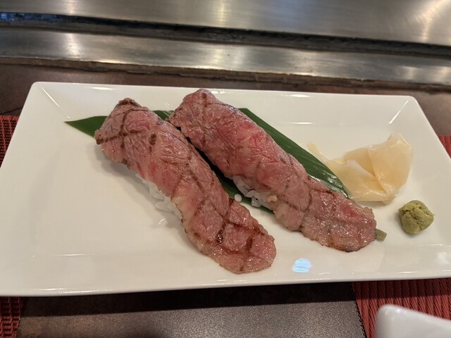 オーダーしたのは、鉄板ランチの短角牛づくし(短角牛ステーキ、ハンバーグ、ソーセージの3種盛り合わせ)と、オプションで黒毛和牛の炙り寿司。