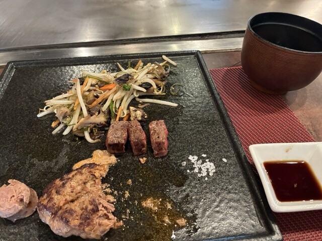 で、メインの短角牛づくし。焼き手さんが、目の前の鉄板で焼いてくれる。こなれた接客。創業65年で、この鉄板はこの店舗出来てから、ずっと使ってるとか。えーっ!そーなんだ、すごいねと、あざやかな包丁さばきとともに、しばし歓談。