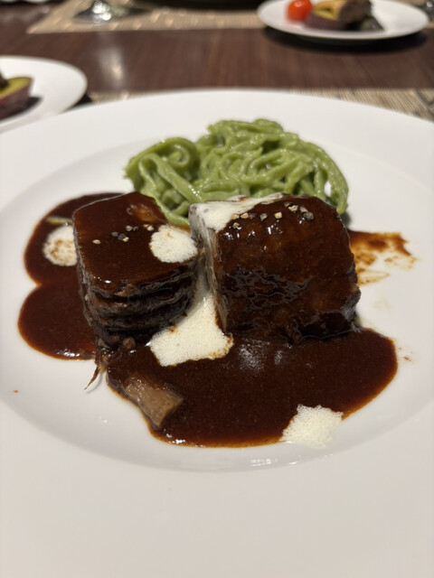 息子が自立をする機会に家族旅行で来たお宿の夜ご飯。港の海鮮料理を食べてタクシーで帰ってくるか、お宿のディナーにするか迷いましたが、宿泊場所のレストラン利用することにしました。東南海トラフ地震を想定して宿泊場所は標高30メートルから50メートル位の高さにある場所を選び防災的な観点でも安心した上での食事です。レストランのメニューは12月にリニューアルされた冬の金目鯛を使ったメニュー。静岡県産の魚、お肉、野菜をふんだんに取り入れていて味付けやスパイスにも工夫がされておりなかなか満足のいくものでした(例えばイチゴベースのディップにゆずが入っているなど)。コース料理だったのでゆっくりと食事が運ばれてきて家族との会話も十分な時間を取ることができました。ありがとう、ごちそうさま。