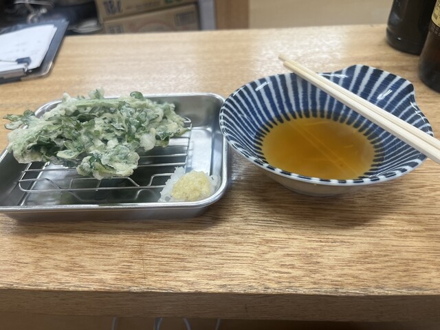 今回のオーダーはガツ刺し、春菊天ぷら、揚げてびち、目玉焼き、クリームコロッケ。