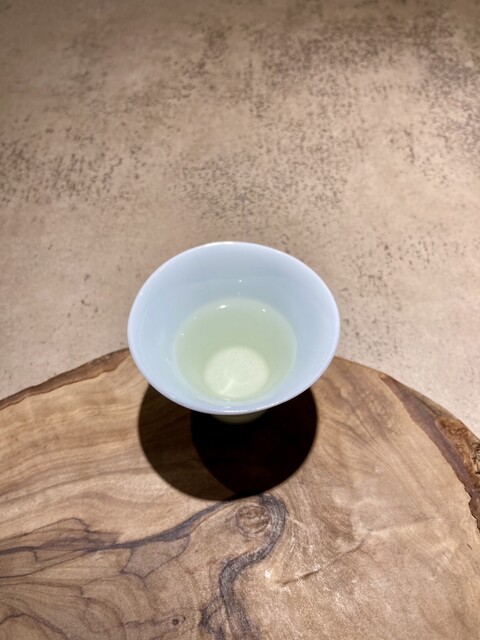 ミキサーで粉砕され、ドリップして抽出されたうま味をワイングラスで。