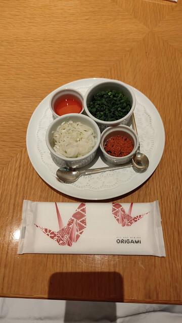 薬味に白髪ねぎ、青ネギ、七味、ラー油があり、少しずつ味変しながら食べていくのが好き。
