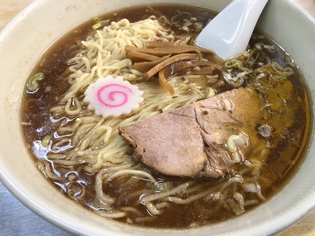 スープの表面にはキラキラと魚粉?がきらめき ガツンと煮干しカツオの風味が効いてます。