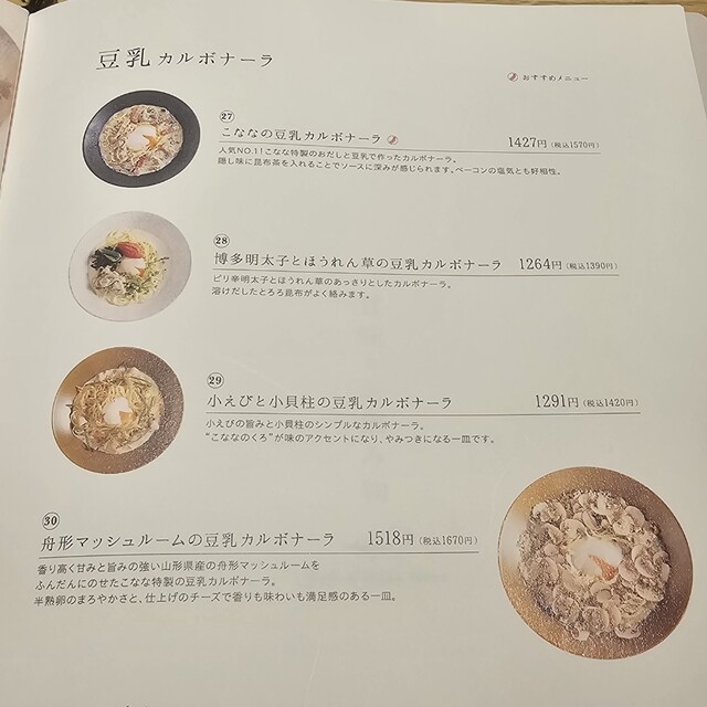 パスタは博多明太子とほうれん草の豆乳カルボナーラ。