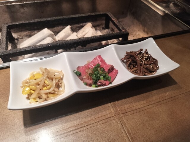 ・冷製極上佐賀牛の炙り、もやしナムル、ぜんまい3種盛り