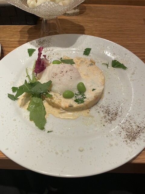 その後はエビのカダイフ、ボテトサラダ、チーズの茶碗蒸し、本マスのマリネ、アナゴのフリット、アスパラとヤングコーンのフリット、エビのアヒージョなどを食べました!どれも本当に美味しくて、値段もリーズナブルで良心的です。