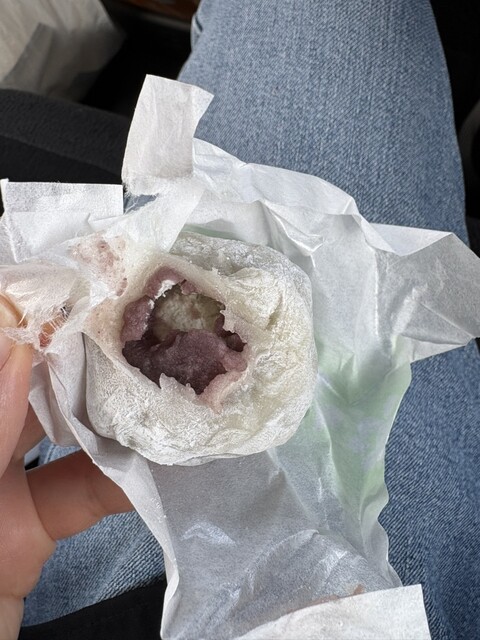 薄い大福の皮に、あんことたっぷりのクリームが包まれています。