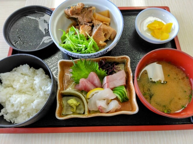 私選択の青島どれ海鮮定食 魚種はPic.3 右上はシビの煮物(鰹節を柔らかく煮付けた感じ)右下は魚二切れの入った味噌味 この値段でこのクオリティーはたぶん県ではメダリスト級。