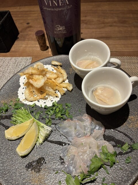 ハタのカルパッチョ・白エビのフリット・はまぐり