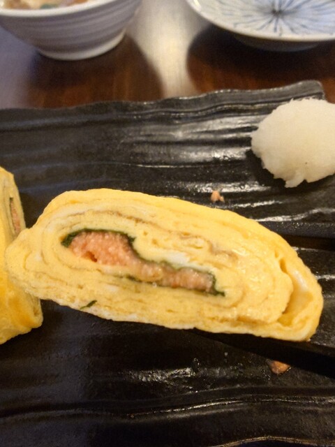 看板メニューの「明太大葉入り厚焼き玉子」は、見た目もふんわり美しく、ひと口で広がる出汁の香りと明太の塩気が絶妙。