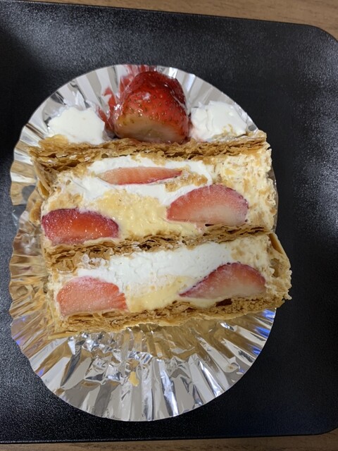 テイクアウトしましたー福岡 いちごタルトで検索すると家からけっこう近くで出てきましたーお昼に行きましたが ランチメニューも人気のようで店内満席…確かに美味しそうなメニュー…デザートも美味しそうなケーキがたくさんありました…とりあえず目的のナポレオンパイ…おっきい…これは、かなりの逸品です…甘すぎないクリーム… だいぶ好きです…クリームできまりますよね…大きいから きれいに食べるの難しいかも…美味しかったーごちそうさまでしたー