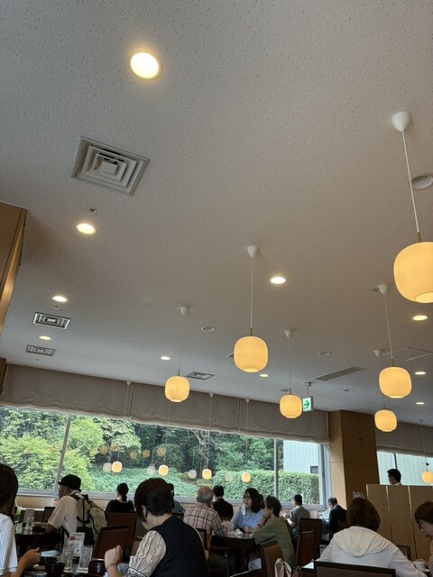 線香花火のようなライトは美しく心和むし、窓からの緑も心地よく、ゆったりした椅子、落ち着いたサービスが歩き疲れた体にありがたいレストランです
