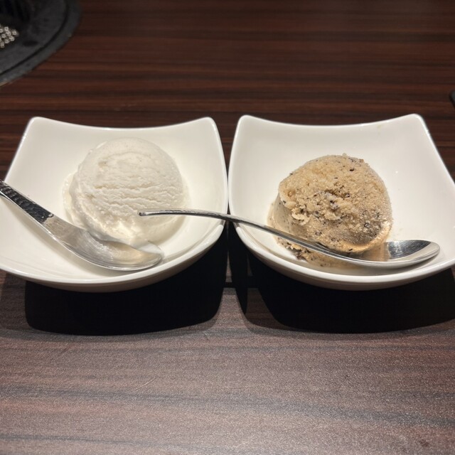 デザートはココナッツバニラとコーヒー×アマレットチェリーのアイス。