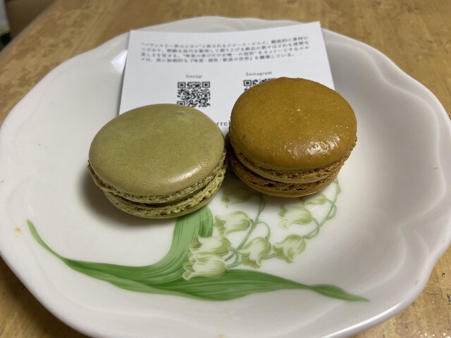 マカロンのチョコ、キャラメル、ピスタチオの3つをいただきました。写真はキャラメルとピスタチオです。すごい! 美味しい! 小さい一粒ながら何層にもなり、色んな世界が凝縮されていて、小宇宙ここにありって感じです。1番人気はピスタチオと聞きましたが、ピスタチオ本来の味が私は好みではないんでしょうね。私にとってはチョコとキャラメルが素晴らしい! 上質なお菓子というのか、すごく丁寧になめらかに作られているのを感じます。とても甘いんですがその甘さがむしろ心地よく、一口かじると幸せな気分に満たされました。これからもたまに自分へのご褒美に買おうと思います。種類によって味が全然違うので、是非お好みの味を見つけてみてください。ごちそうさまでした。