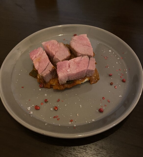 柔らかいのは当たり前!ピンクペッパーを乗せるとさらに豚の脂の甘さがジューシーでいつまでも噛んでいたかったー飲み込みたくなかった。