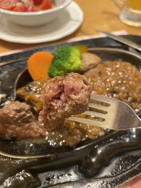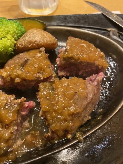 まん丸のハンバーグを半分にして鉄板の押し付けてジューーーーって、ソースかけてもらっちゃったけど常連さんは掛けず、まずは塩コショウだけで食べるんですってね。