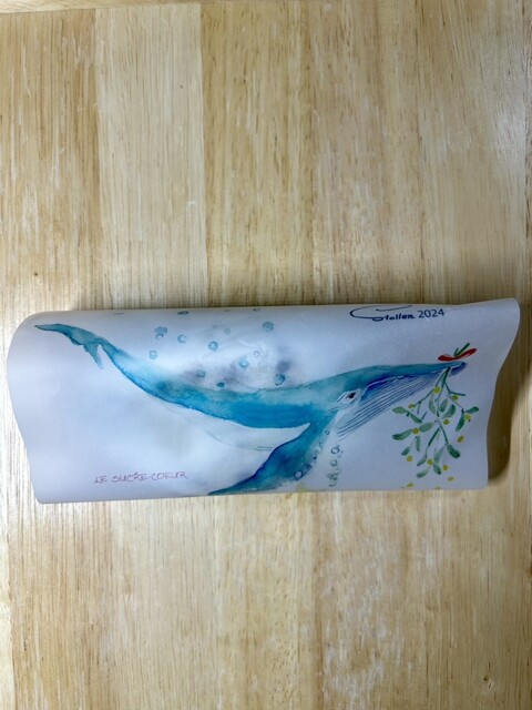 シュトーレンが2重のラップに包まれ、パン袋に入れられ、パッケージに包まれている