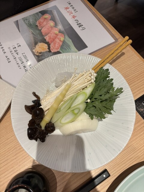 店員さんが野菜を手際よくお鍋に並べて下さり、お野菜の上に被せるようにお肉を乗せていました。(こうすることでお肉が崩れず、野菜は蒸し焼きになるそう。)