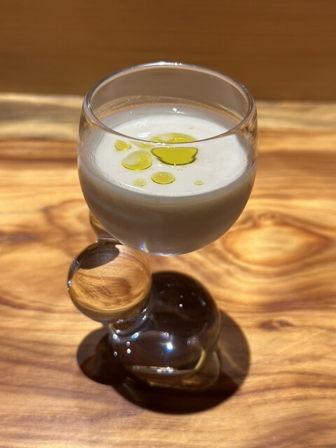 北海道寿都のあん肝。ペースト状にしてあり、はちみつが掛けられています。蒸したままのものばかり食べてきたため、裏漉しされたものは初めてです。見た目通り滑らかでした。デラウェアのデザートワインとよく合います。以前いただいた蒸したあん肝とソーテルヌのデザートワインの組み合わせの方が個人的には好みです。