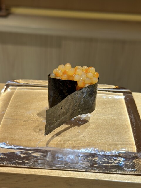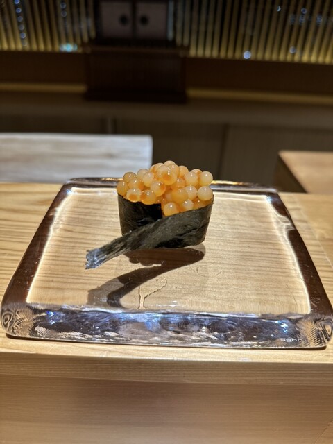 無二のキャビアの下にはいつも蟹さんがいます。今回は松葉ガニ。ズワイガニの雄ですね。先月他店でセコガニをいただいたのを思い出しました。蟹の香りと旨みをとても強く感じます。