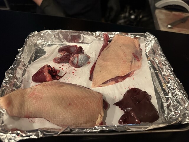 入店時から壁に鴨が掛かっているのが気になっていましたが、それを目の前で捌いてくださいました。命のありがたみを感じ、余す所なくいただきます。真鴨さんありがとう。