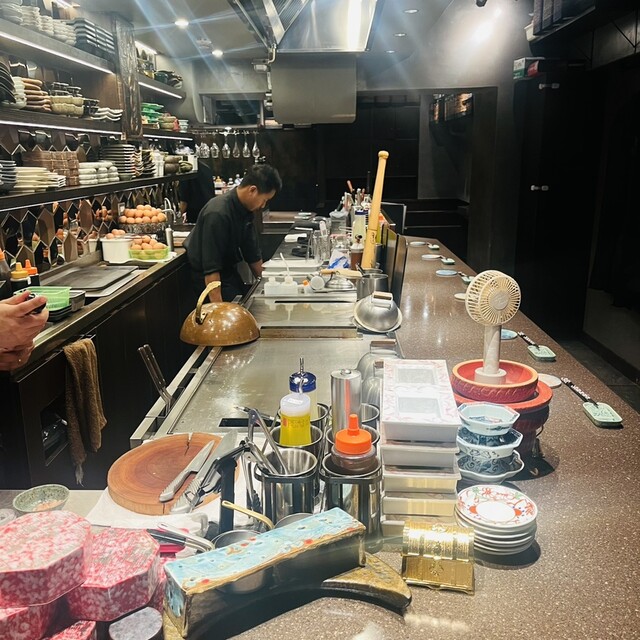 店内は、カジュアルで、落ち着いた雰囲気でした。テーブル席とカウンター席があり、鉄板を囲むように作られたカウンター席は目の前で料理が作られる臨場感も楽しめます。