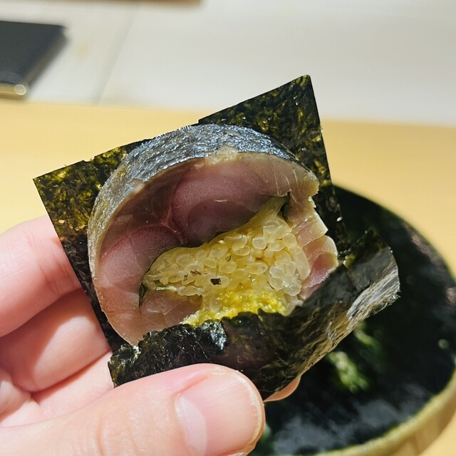 塩と酢で〆た鯖に大葉とガリを入れて有明のりと一緒に巻くことで海苔の風味と心地の良い酸味のきいた鯖が相性抜群でした!