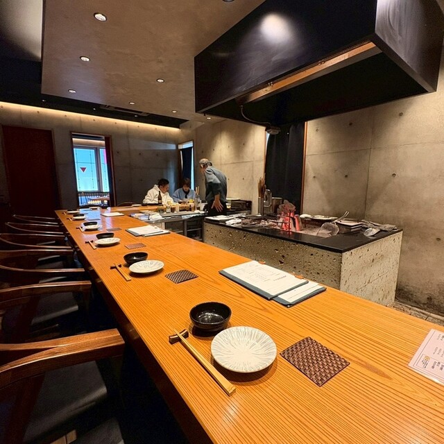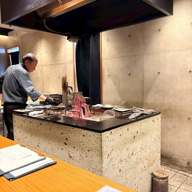 店内は、目の前に大きな囲炉裏を囲うカウンター席があり、オープンキッチンなので料理が出来上がる様子がライブ感で楽しめました。落ち着いた温もりのある空間でゆったり過ごせました。
