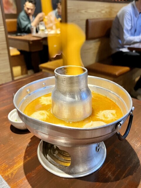 鍋の中から実際に火が燃え上がってビックリ!中から出てきたのは肉詰め水餃子で、辛口のスープが合いますね。