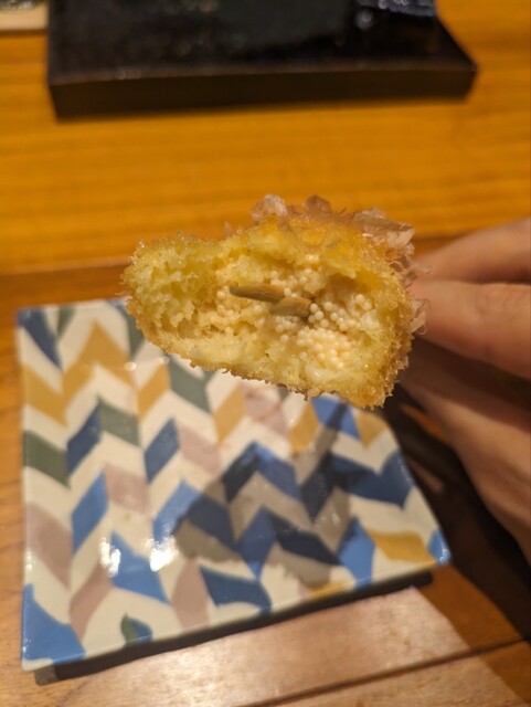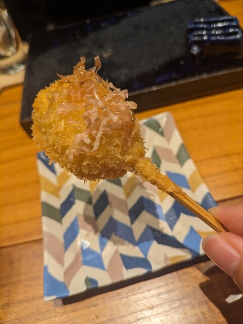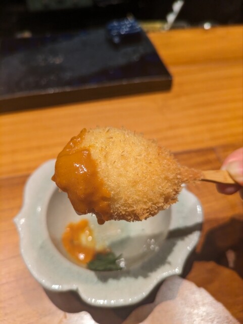 賀茂ナスの串揚げは最近食べたナスで1番美味しかったです。食感が非常に良く、一言で言うなら「溶ける」です。上に乗っている炙り明太子の香ばしさがマッチして良かった。
