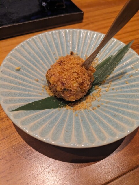 愛知県産のスイートコーンはそのまま揚げずに豆腐を繋ぎに使っているのが斬新なともろこしの揚げ物でした。外はさっくさくでなかの食感もシャキシャキしてて楽しく、甘くて美味しかったです。豆腐の繋ぎがあることでシャキシャキの食感と柔らかさを交互に感じ、飽きません。普通のトウモロコシの串揚げと違い茎がないので、食べるのに全く苦労しなかった。