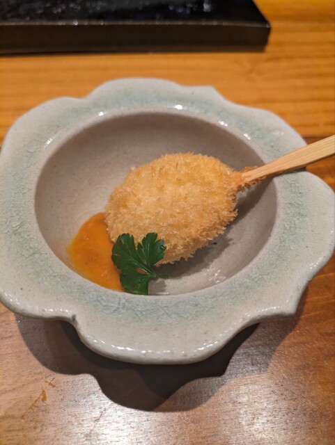 続いて、本ズワイガニのカニクリームコロッケ(アメリケンソース)を頂きました。私はカニクリームコロッケが大好きで、実はかなりうるさいですが、ここのカニクリーム串は絶品でした。カニ本来の旨みがしっかりとクリーム全体から感じることができ、揚げ加減も完璧でした。アメリケンソースもとっても相性が良く、完成度の高いカニクリーム串でした。