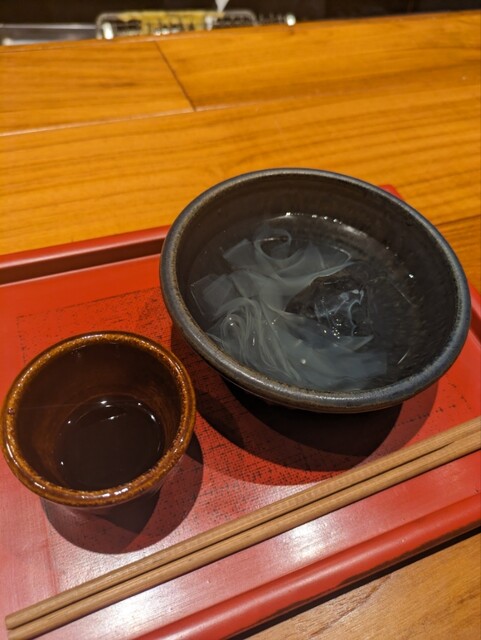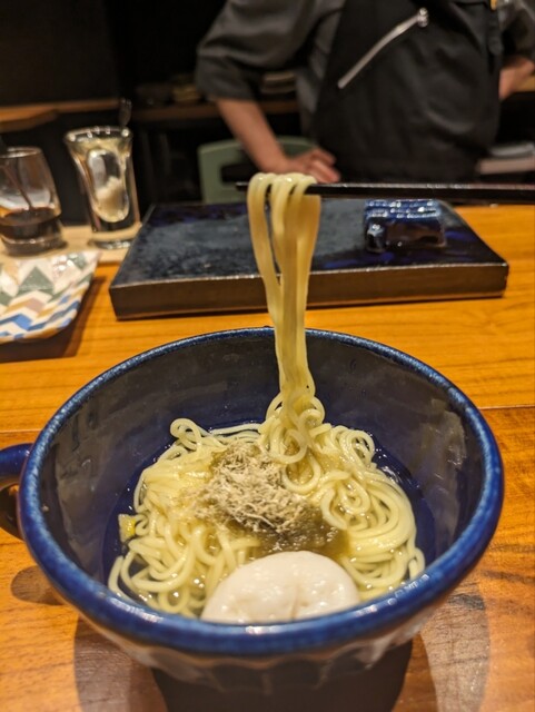 昆布水冷麺にはしんじょという白身魚とホタテの貝柱の練り物が入っており、あっさりとした京風の味わいが特徴です。ゆずの風味がさわやかさを演出し、さっぱりとした味わいを楽しめました。この料理は揚げ物が多かったため、さっぱりとした一品が嬉しいアクセントとなりました。