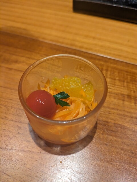 京人参とオレンジとトマトの甘味漬けは、丁寧に湯むきされたトマトとにんじんの組み合わせです。にんじんの酸っぱさとトマトの甘さがマッチし、爽やかで調和の取れた味わいを楽しめました。