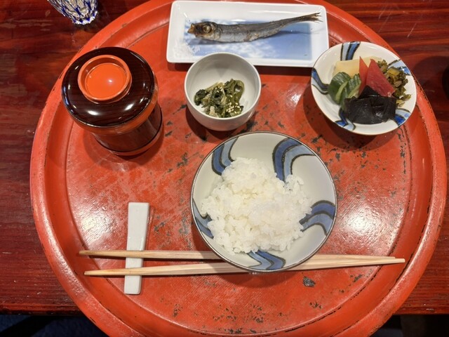 ある意味こちらのの店のメインともいえる定食ですが、竈で炊いた炊き立ての白米、めざし、お新香、わらび、お味噌汁。