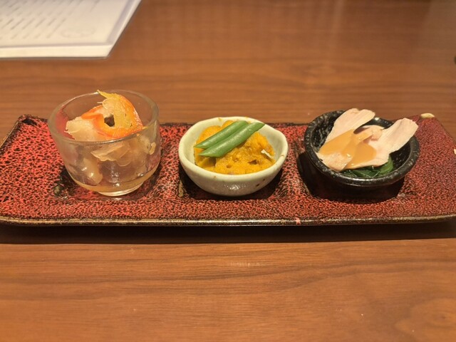 さすがにコース料理は用意できないため、先付け、鰹の塩タタキ、魚料理、肉料理の4点の『おつまみセット』を用意して頂きました。
