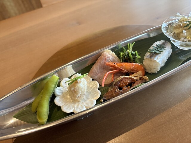 内容は、氷魚の土佐酢、若鮎の握り寿し、こごみの和え物、鴨ロース、琵琶湖の手長海老、鮒寿しの甘露漬け、2年越し鮒寿しのとも和え、えんどう豆