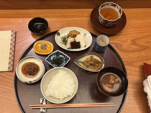 南魚沼のコシヒカリ(新米)、赤出汁、香の物、ちりめん山椒、わさび漬け、有明の海苔、牛すじの時雨煮、メンチカツ、マグロの山椒煮